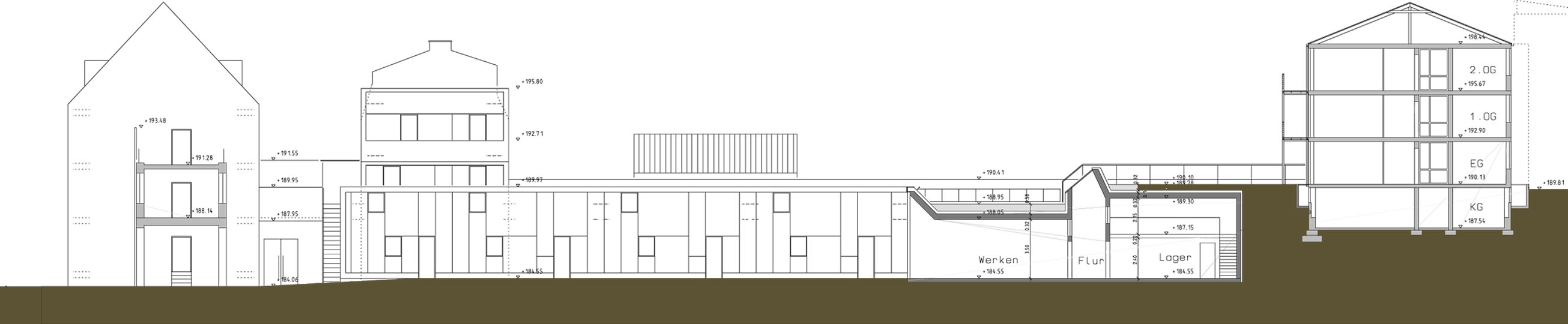 Aufgabe war die Erweiterung eines bestehenden innerstädtischen Gebäudekomplexes zur Werkstatt mit Verwaltung, Wohngruppen und Dienstwohnungen.