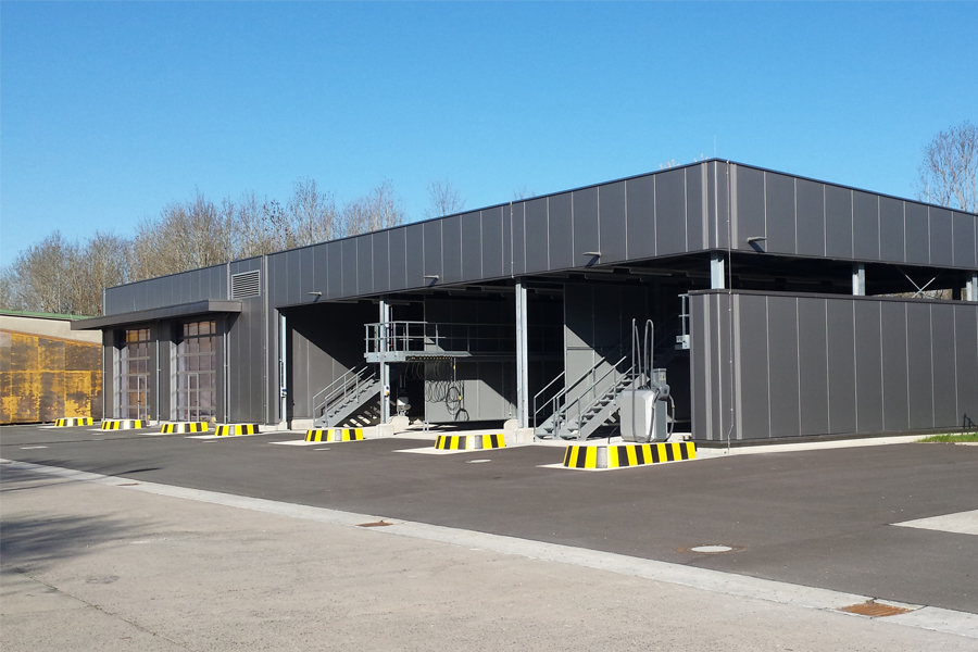 Die offene und die geschlossene Halle bilden zusammen eine Einheit und dienen zur Reinigung von Bundeswehrfahrzeugen mit einem Gesamtgewicht bis ca. 60t. Zwischen den einzelnen Waschplätzen, an den Längsseiten, sind jeweils Arbeitsbühnen als Art Stege in einer Höhe von ca. 2,50m angeordnet, um das Reinigen der Fahrzeuge von oben bzw. des Daches zu ermöglichen. Direkt aneinandergrenzende Waschplätze sind durch Spritzwände getrennt. Die zwischen den Waschplätzen angeordneten Technikräume beinhalten Heizung, Lüftung, Sanitär sowie eine Hochdruckreinigungsanlage, Elektro- und EDV-Installationen. Die Hülle der Stahlkonstruktion bilden im Bereich der Wand- und Dachflächen Sandwichpaneele. Die geschlossene Halle wird durch zwei motorisch betriebene Sectionaltore mit Schlupftür, die vollflächig verglast sind, verschlossen. Fenster mit Wärmeschutzverglasung, auf der Rückseite der geschlossenen Halle, sorgen für mehr Belichtung und Tageslicht.