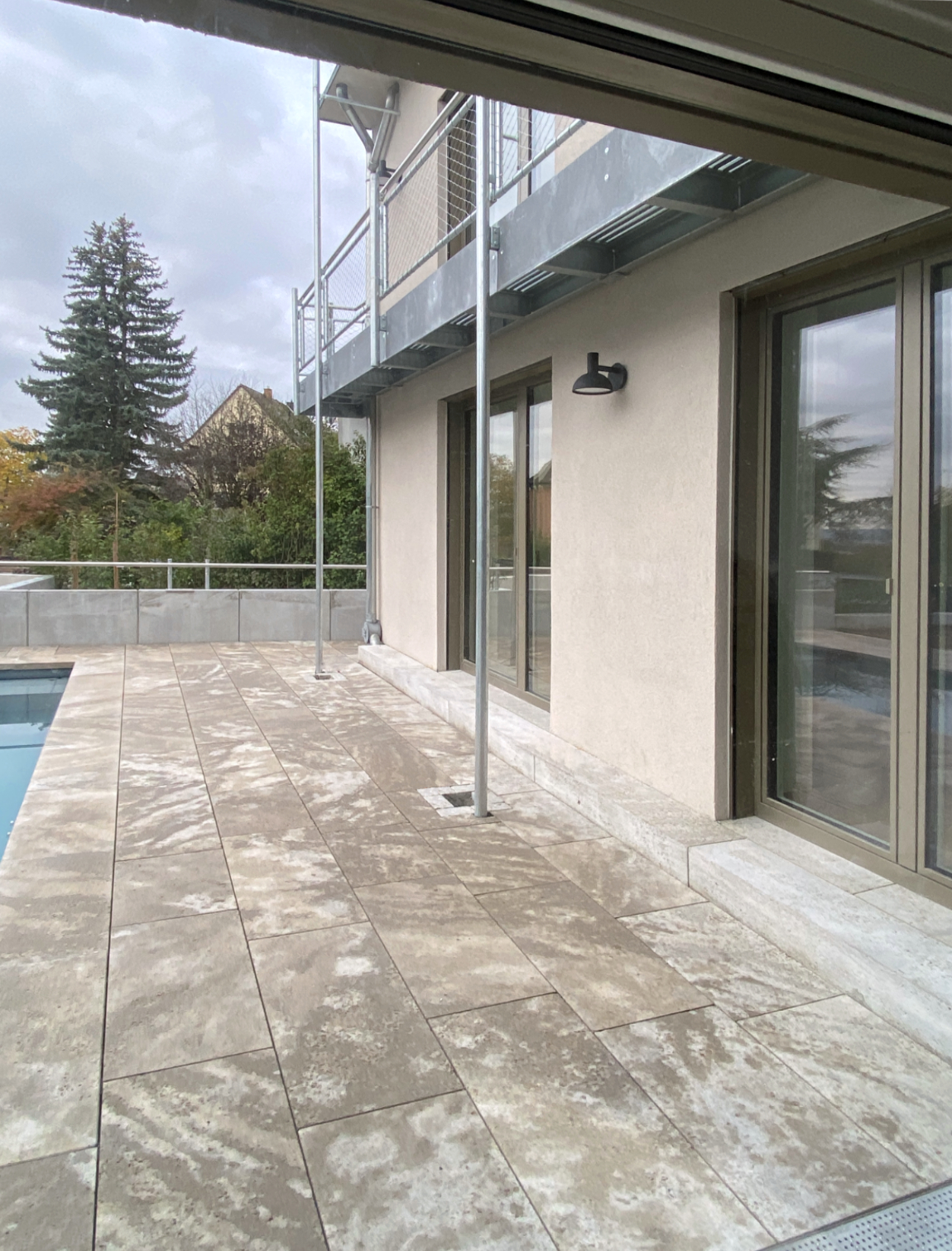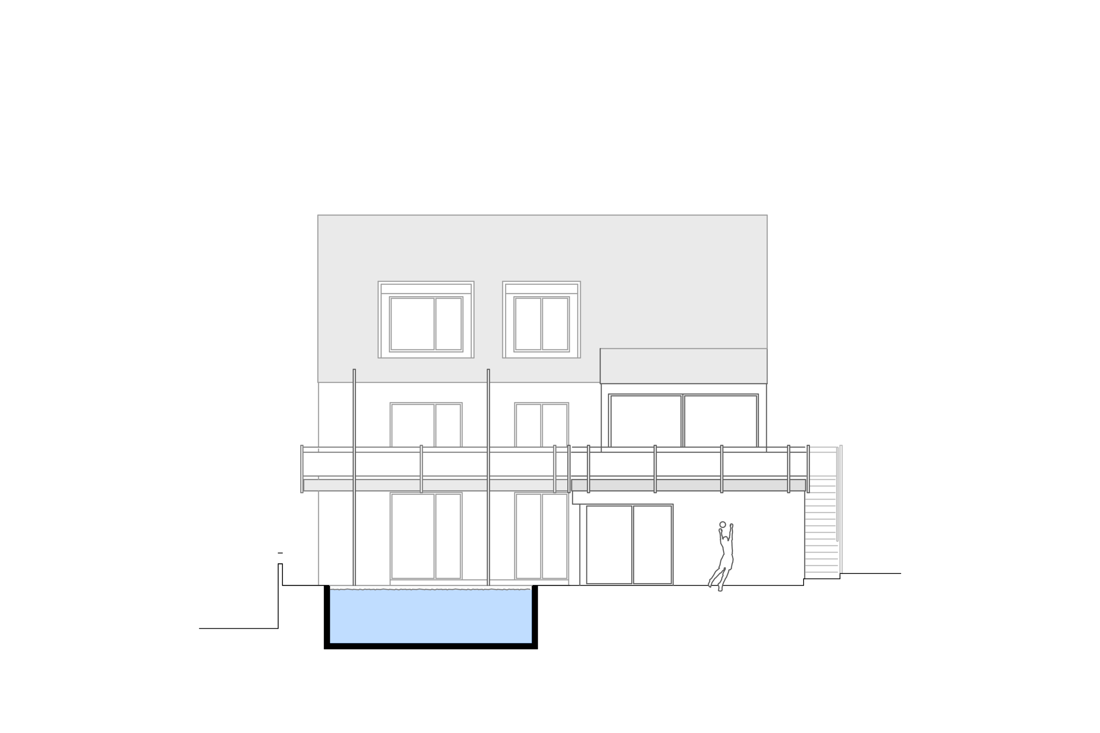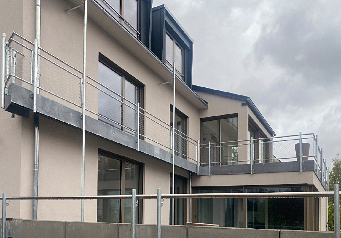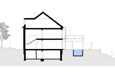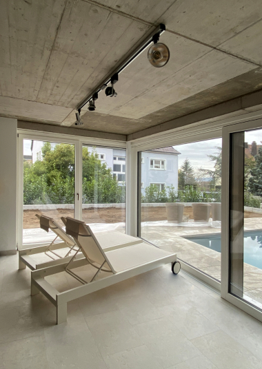Eine Wohneinheit umfasst das Erdgeschoss und 1. Obergeschoss, eine weitere Wohneinheit befindet sich im Dachgeschoss. Die Wohneinheiten werden durch das bestehende, innenliegende Treppenhaus erschlossen. Die Wohneinheit im EG/OG erhielt zusätzlich eine interne Treppe. Zudem wurde die Wohneinheit im EG/OG durch einen eingeschossigen Anbau erweitert. Der Anbau umfasst einen Wellnessbereich mit Sauna, Dusche, WC sowie einem Ruhebereich, mit Blick Richtung Terrasse und Pool und dient im Obergeschoss gleichzeitig als Dachterrasse. Erschlossen wird die Dachterrasse von einer dreiseitig verglasten Wohnraumerweiterung, einem großzügigen Wohn- & Essbereich, sowie einem vorgehängten Stahlbalkon im 1.Obergeschoss. Vom Erdgeschoss wird die Dachterrasse zusätzlich mittels einer Stahlaußentreppe erschlossen. Der bestehende Garten im Süden, wurde für eine Terrasse mit Pool großflächig umgestaltet, zudem wurde eine Zisterne mit Rigole verbaut.